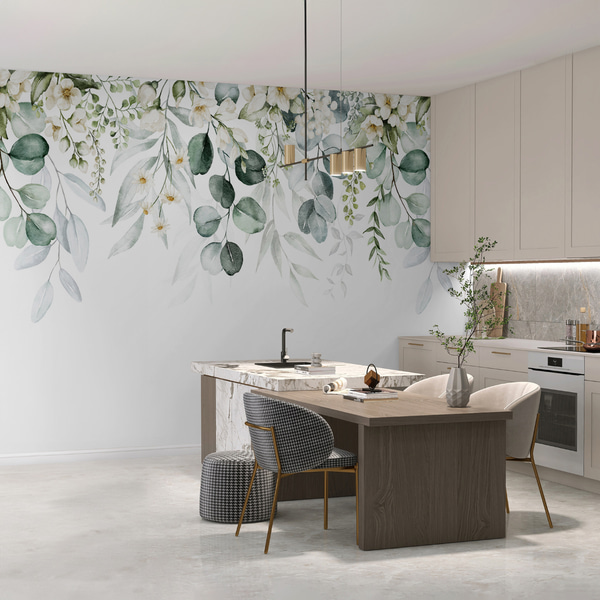 Construction vehicles, mountain landscape, balloons and clouds in scandinavian style