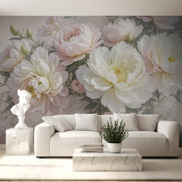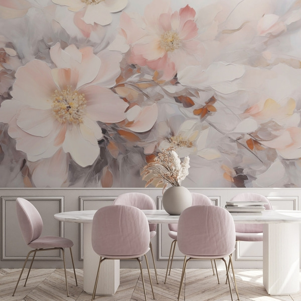 Peintures murales Fleurs nacrées dans des tons beige-gris et crème laiteux