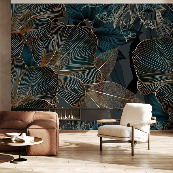 Peintures murales Fleur bleue abstraite symbolisant le calme, avec des feuilles dorées