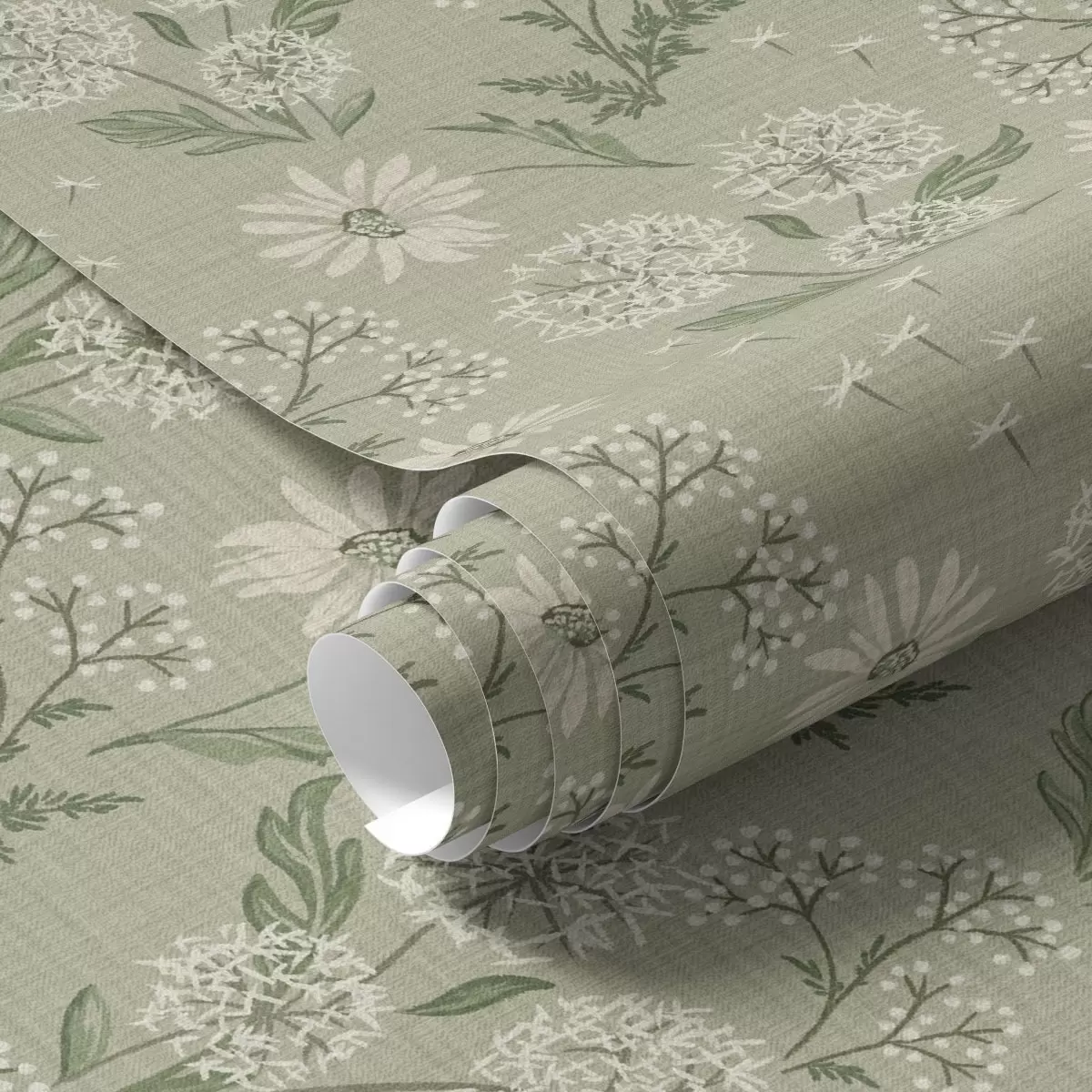 Papiers peints Pissenlits et marguerites, motif botanique sur fond gris-vert Nr. a00224