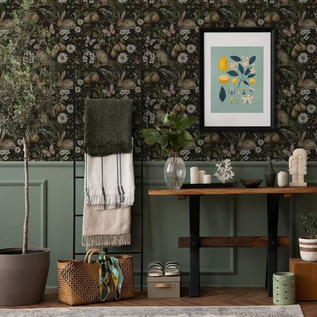 Papiers peints Lapins, poires, fleurs et insectes réalistes sur fond sombre Nr. a00401