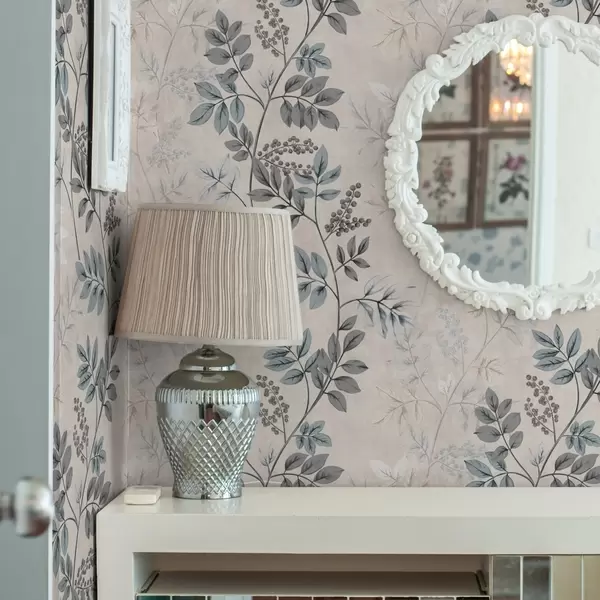 Papier peint Branches de baies dans des tons pastel avec des feuilles gris-bleu a00443