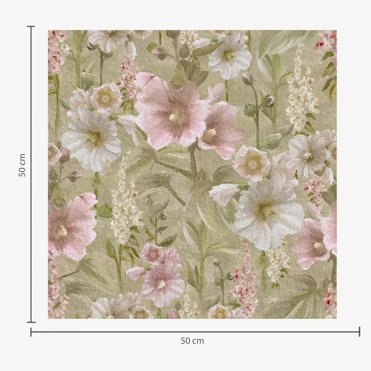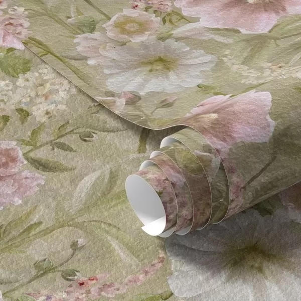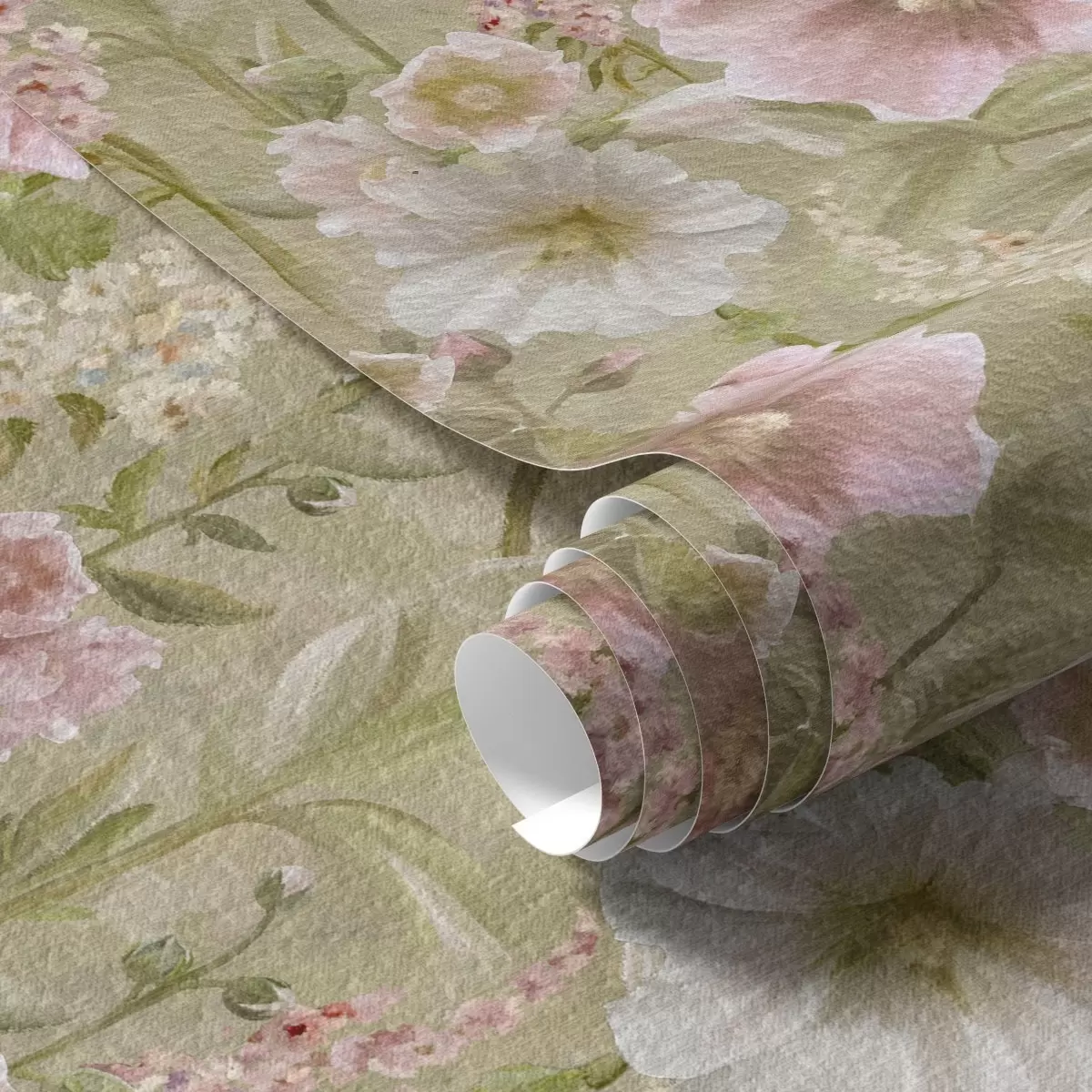 Papiers peints Roses trémières romantiques, roses et blanches, sur un vert discret Nr. a00456