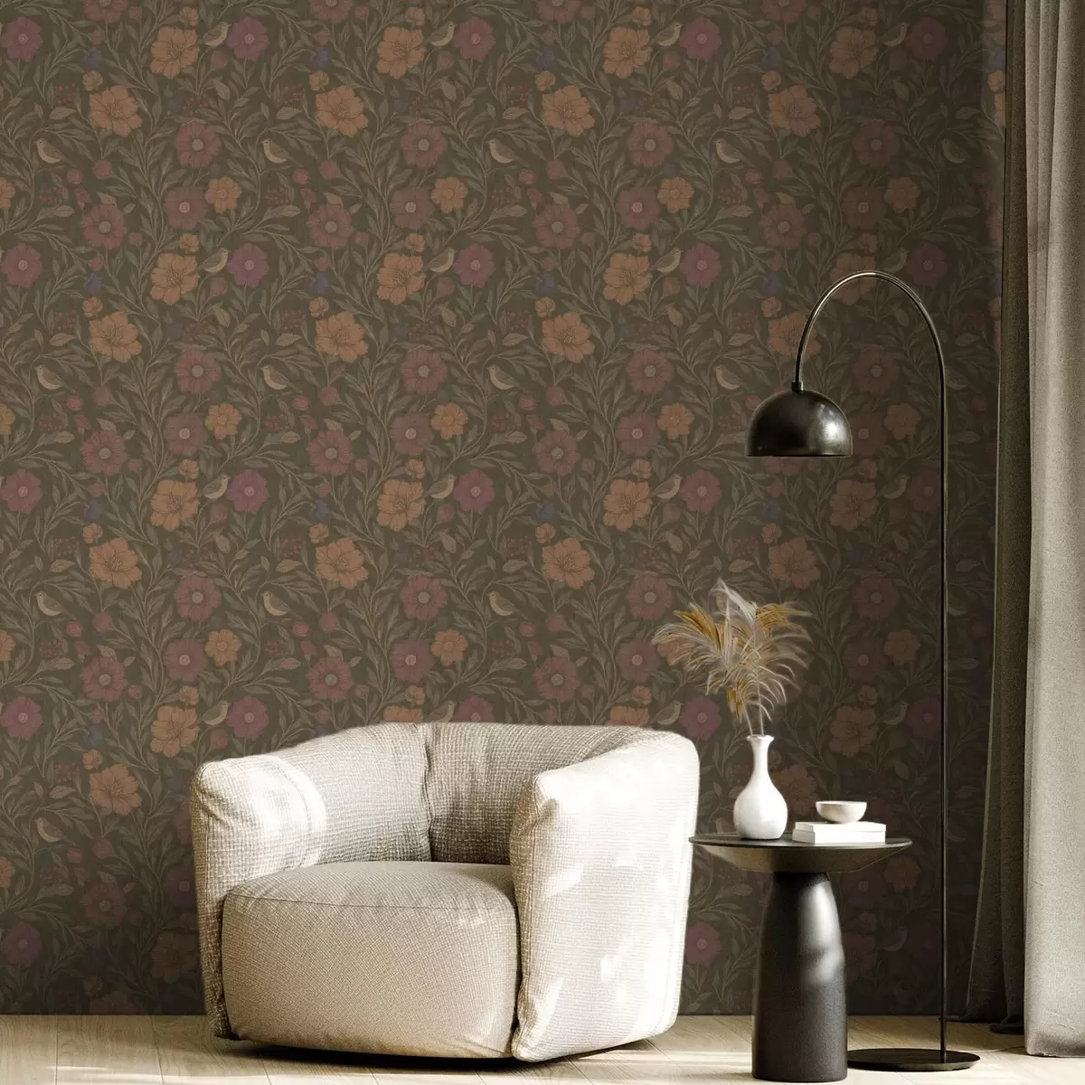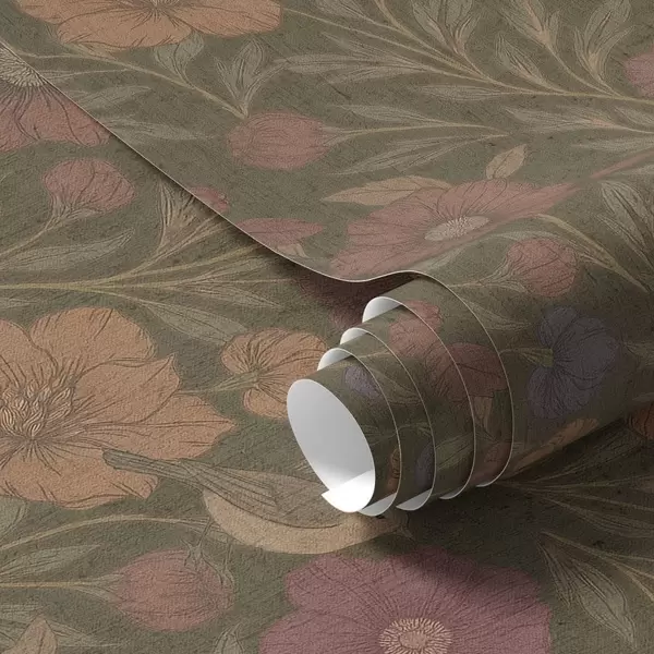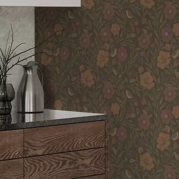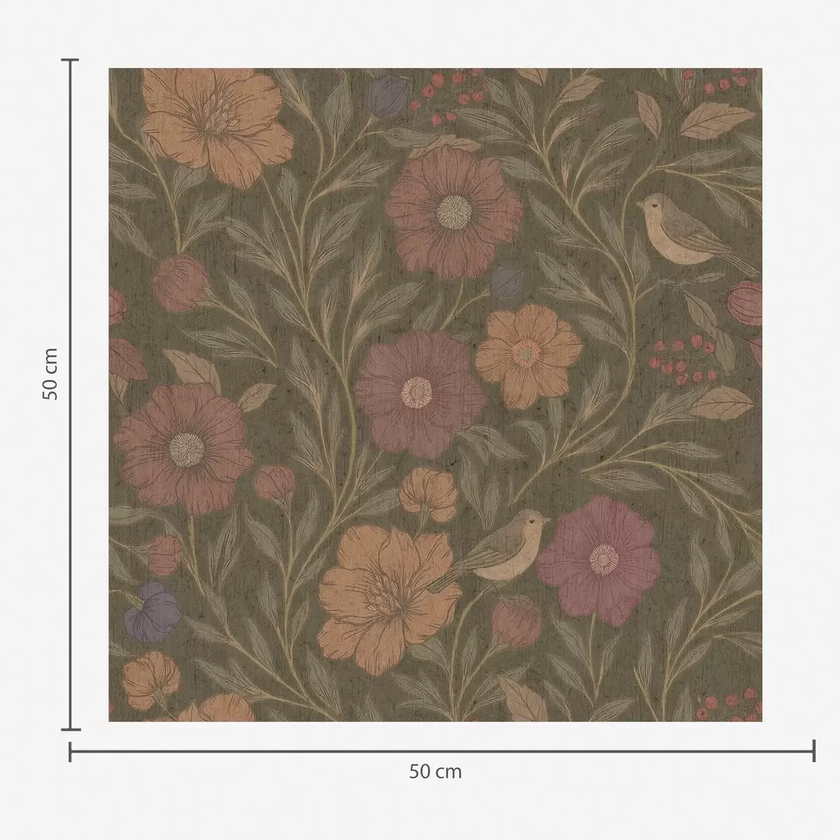 Papiers peints Fleurs d'automne et oiseaux sur fond brun olive Nr. a00605