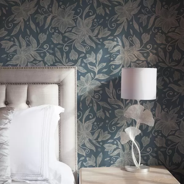 Papiers peints Fleurs linéaires crème sur fond bleu, volutes délicates Nr. a00630