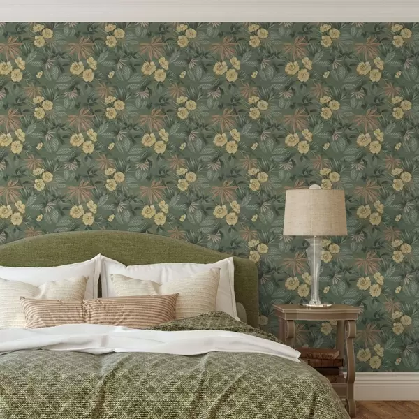 Papiers peints Fleurs jaunes au milieu d'une texture feuillue verte Nr. a00718
