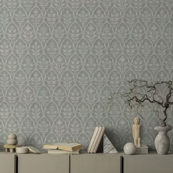 Papier peint Damassé menthe avec fins médaillons floraux a00741