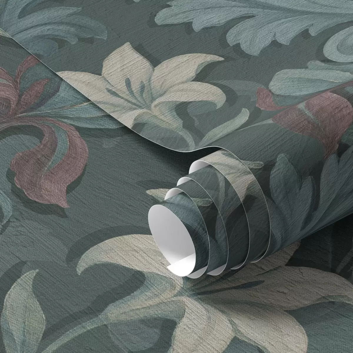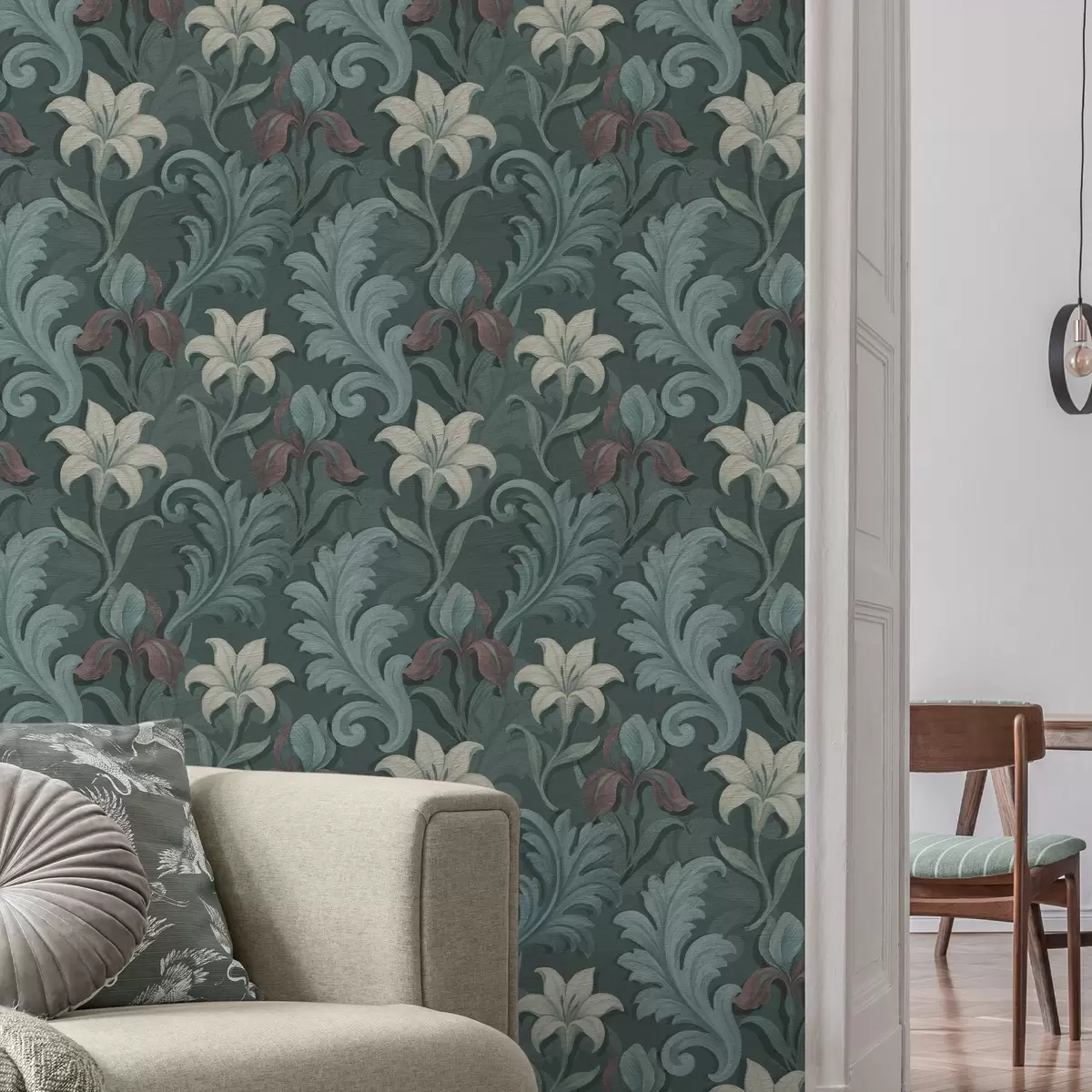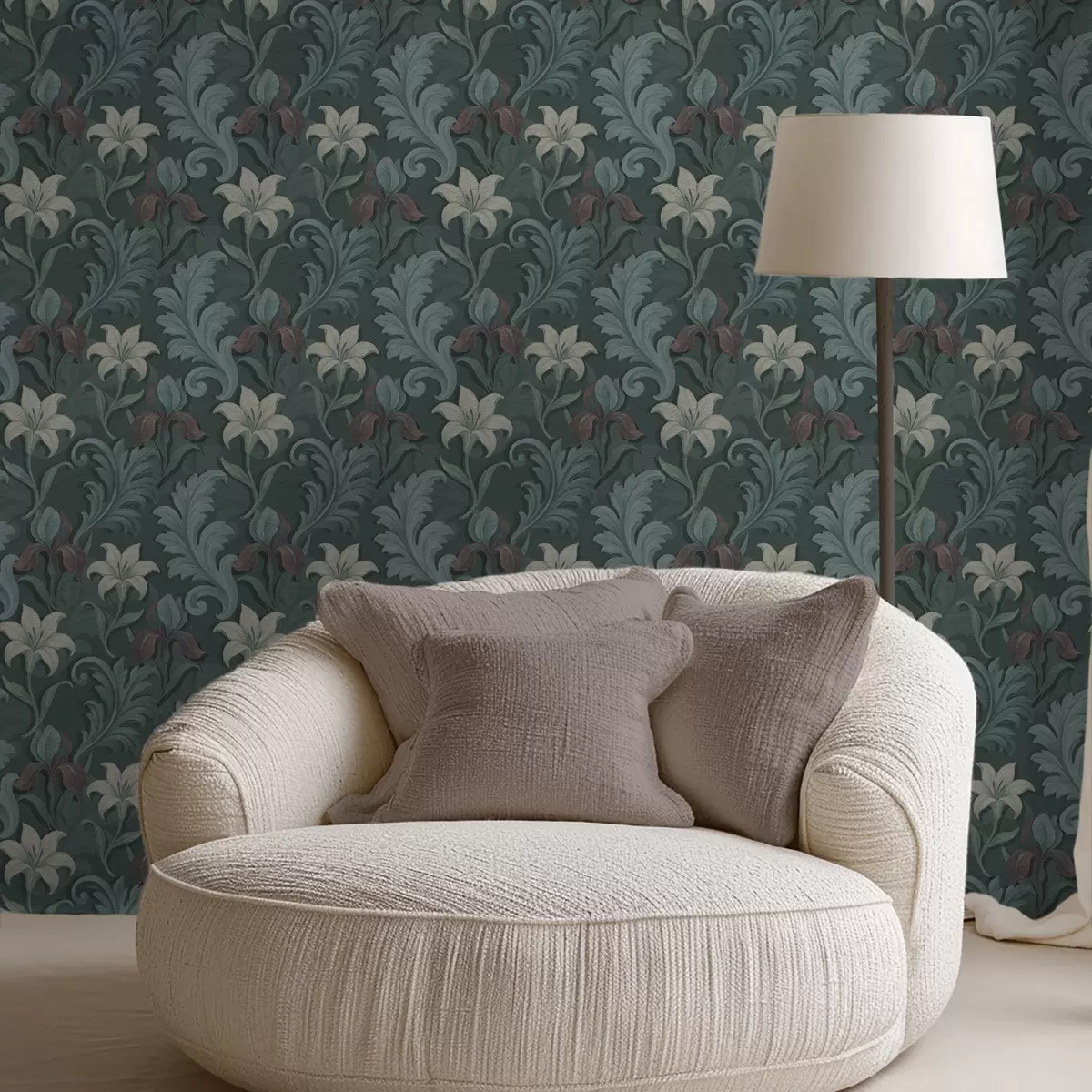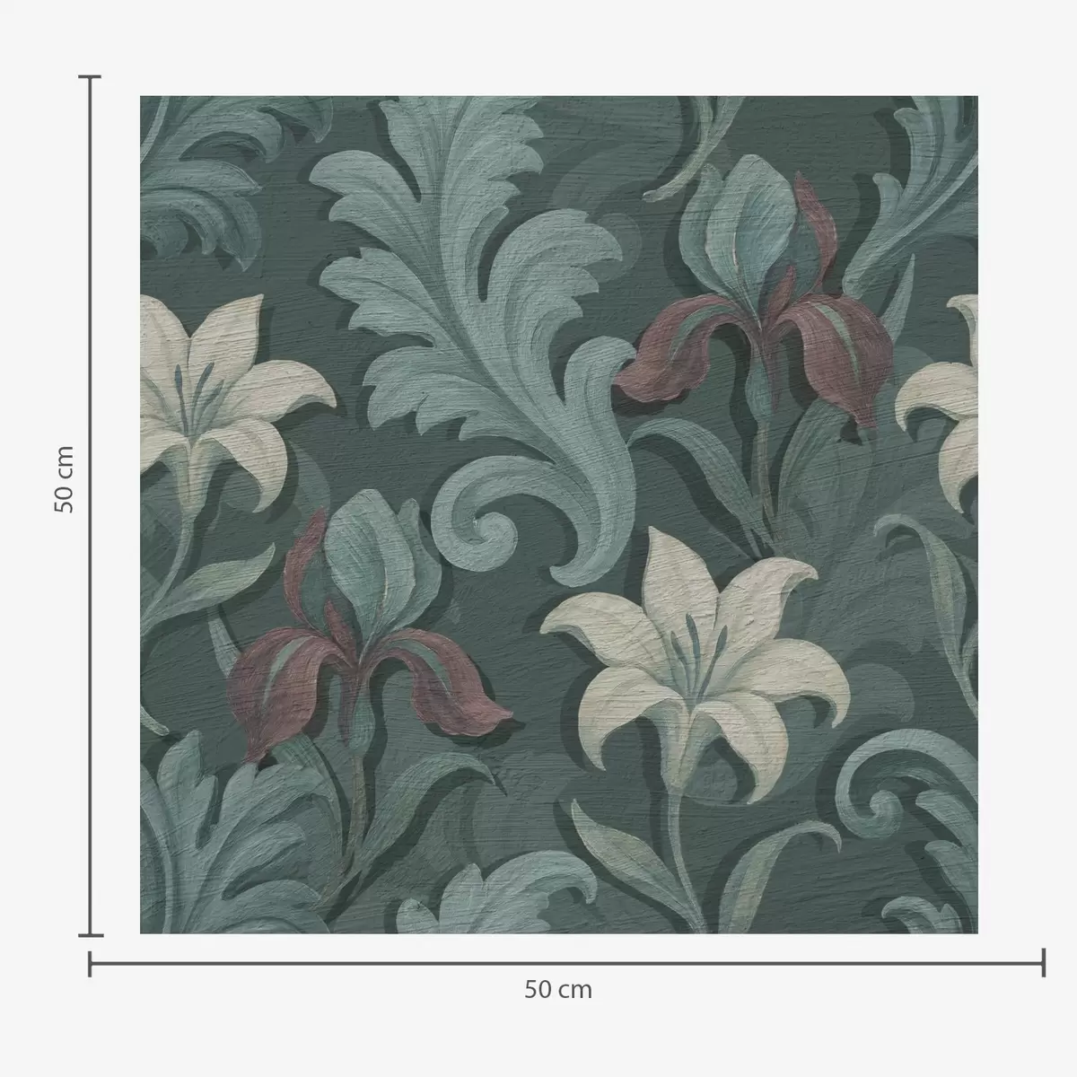 Papiers peints Fond vert foncé avec des iris et des feuilles décoratives Nr. a00755