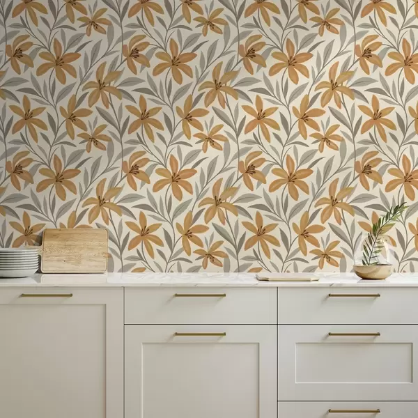Papiers peints Lys jaunes et feuilles gris-vert sur fond clair Nr. a00757