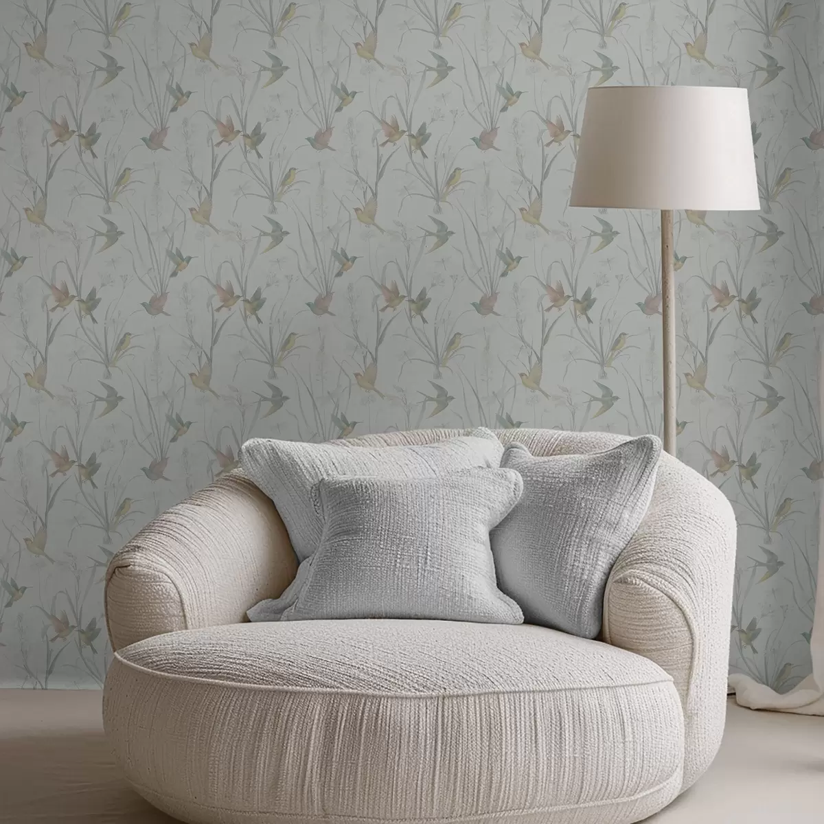 Papiers peints Oiseaux parmi les herbes des prairies sur fond gris clair Nr. a00776v1