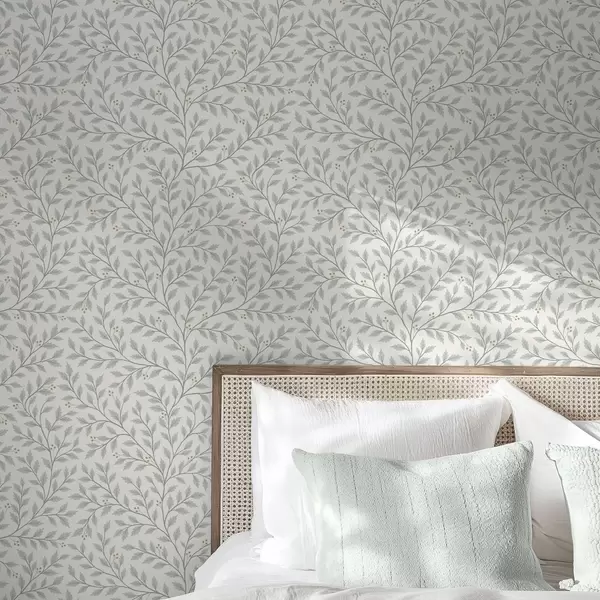 Papiers peints Branches avec feuilles et baies, crème claire et sauge Nr. a00783