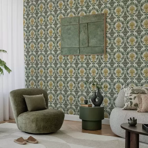 Papiers peints Damas avec des volutes vertes sur fond clair Nr. a00828v1