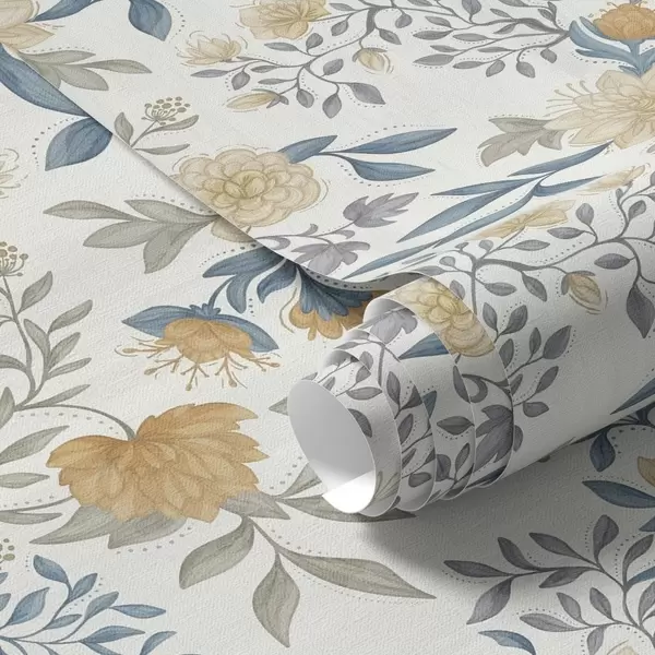 Papiers peints Fleurs jaunes et verdure bleue sur fond blanc laiteux Nr. a00934v2