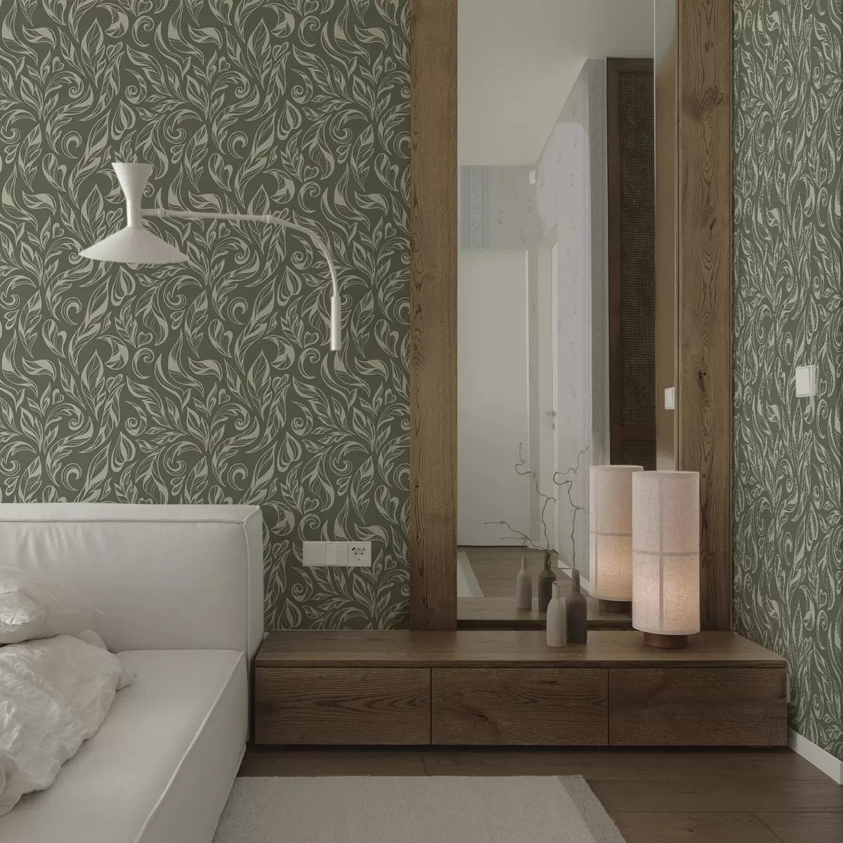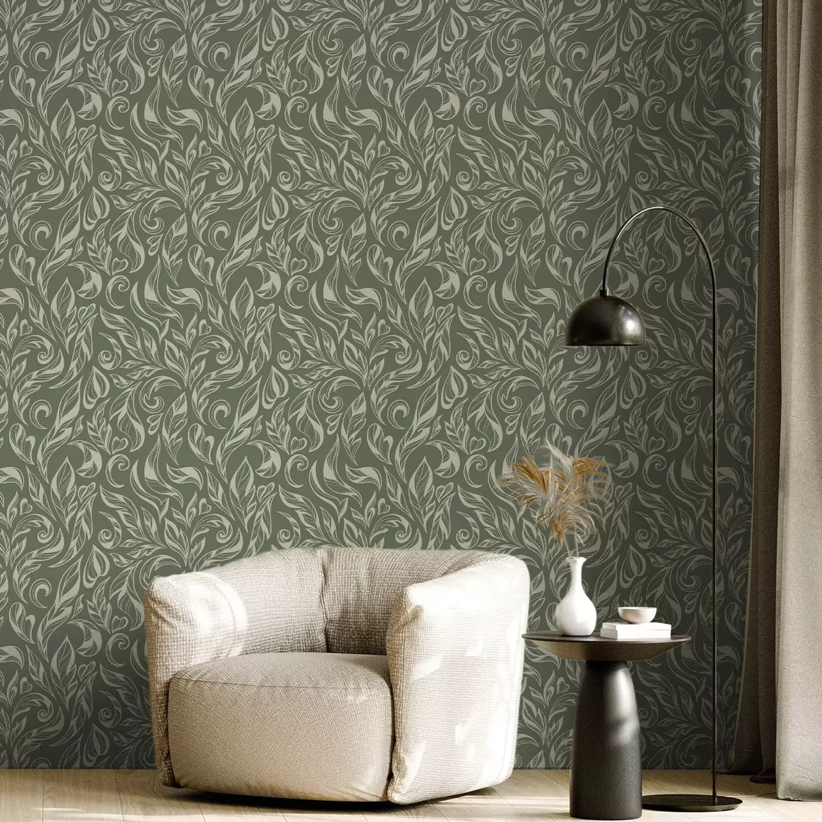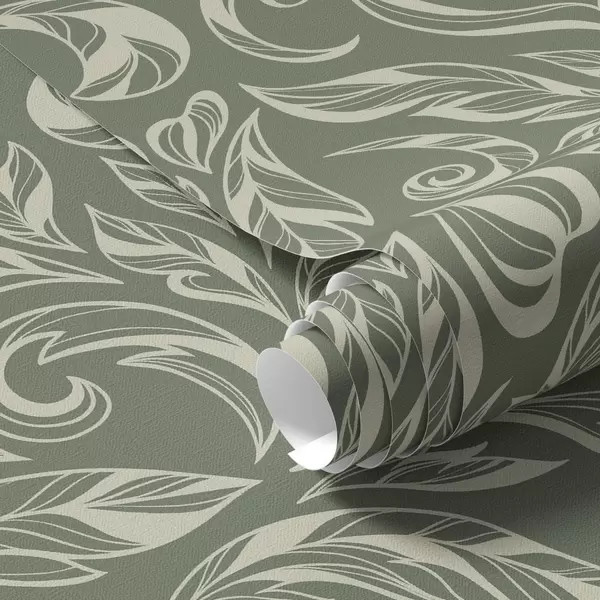 Papiers peints Ornement feuillu crème sur fond gris verdâtre Nr. a00940v2