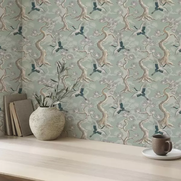 Papiers peints Grues parmi les branches courbées sur un fond doux couleur sauge Nr. a01023
