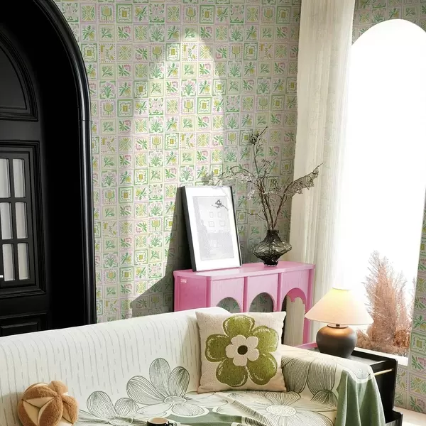 Papier peint Carrés aquarellés avec des branches roses et vertes a01082