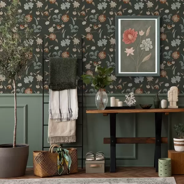 Papiers peints Fond vert foncé avec fleurs et feuilles décoratives Nr. a01086