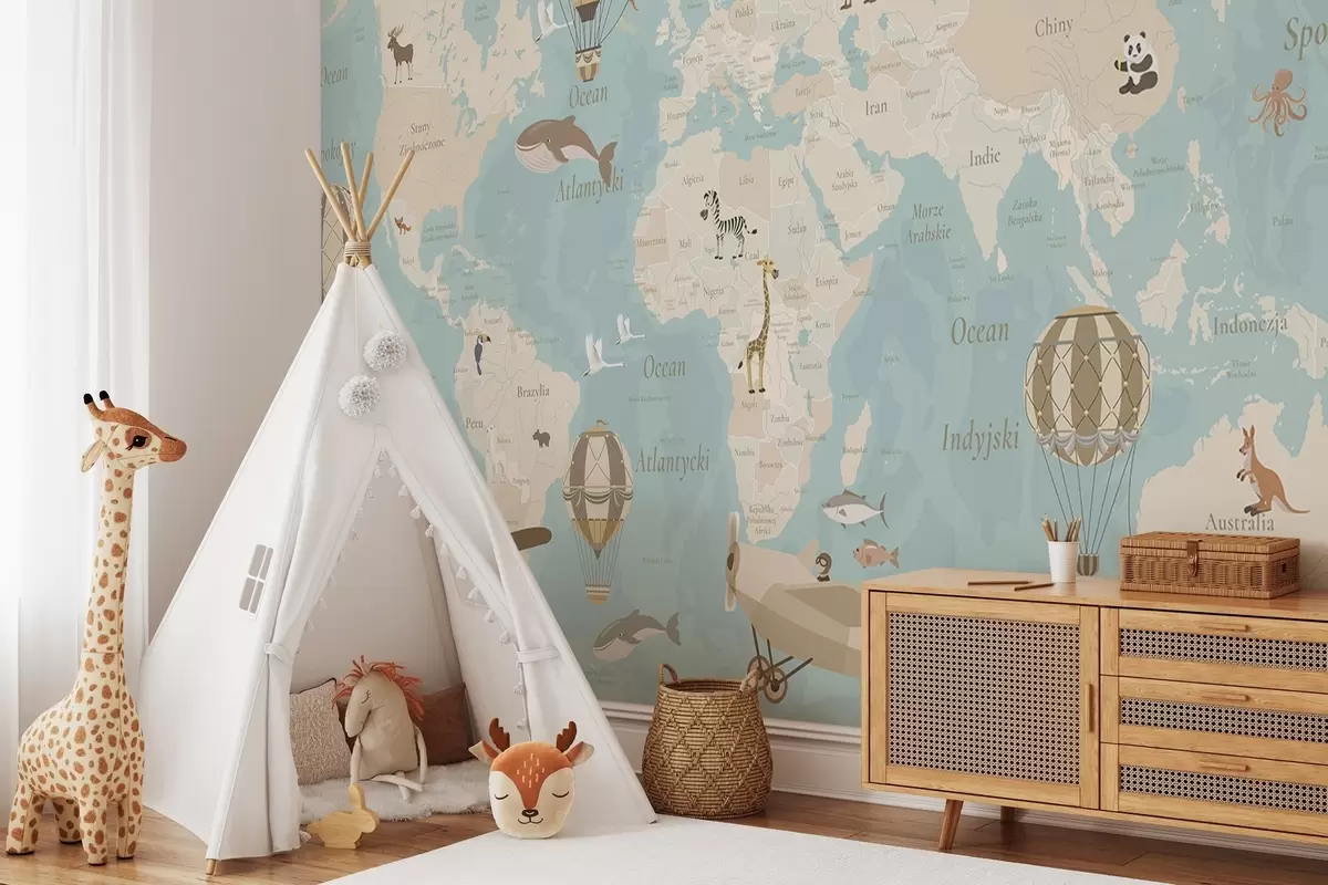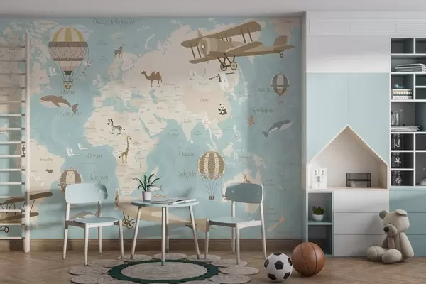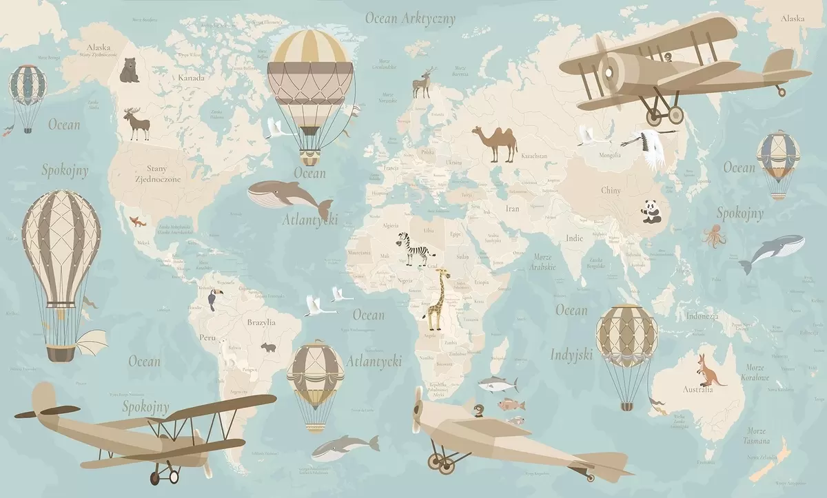 Peintures murales Carte du monde pour enfants avec des animaux, des avions et des montgolfières. En polonais. Couleur bleue Nr. c00003plv1