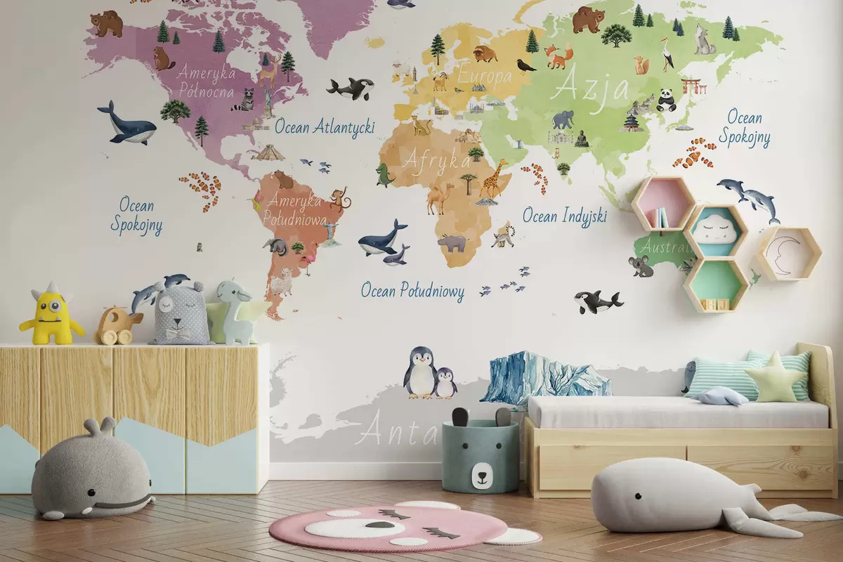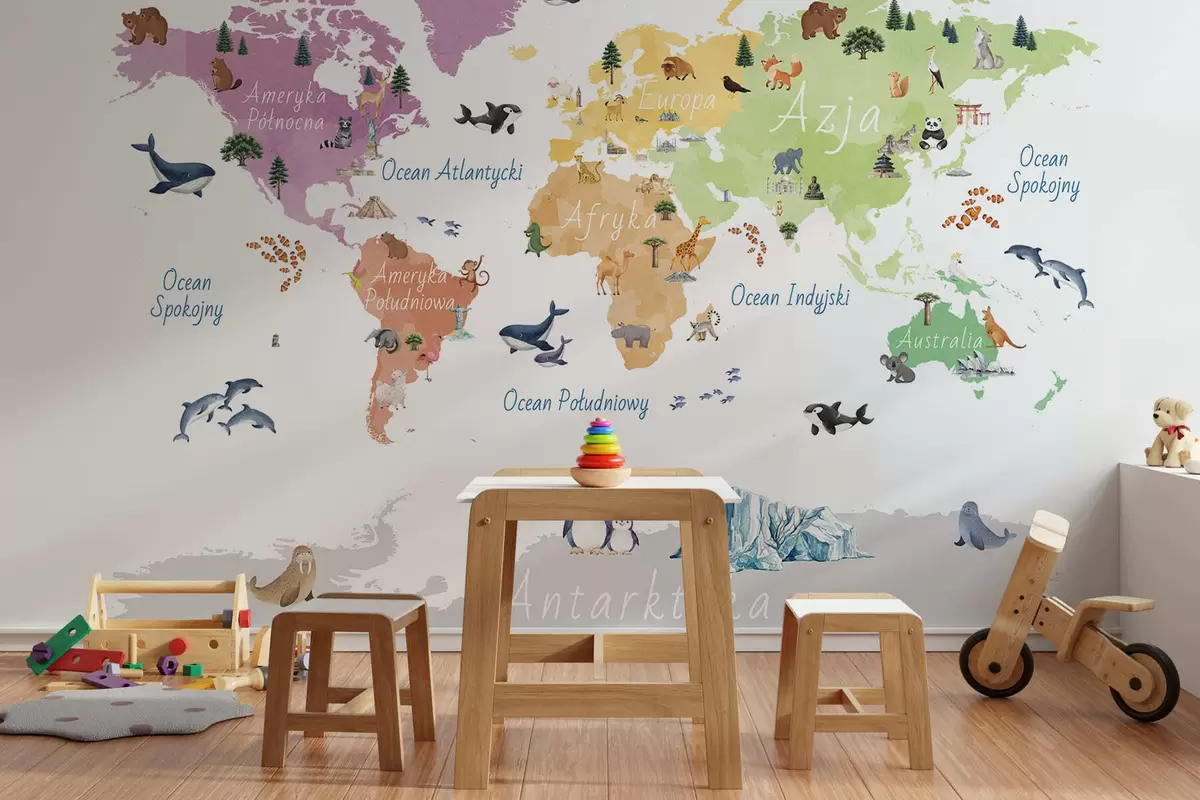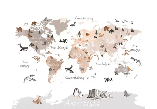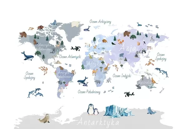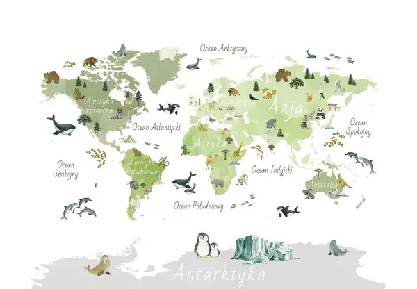 Peintures murales Une carte en couleurs de style aquarelle représentant des animaux, des plantes et des bâtiments. Légendes en polonais Nr. c00009pl