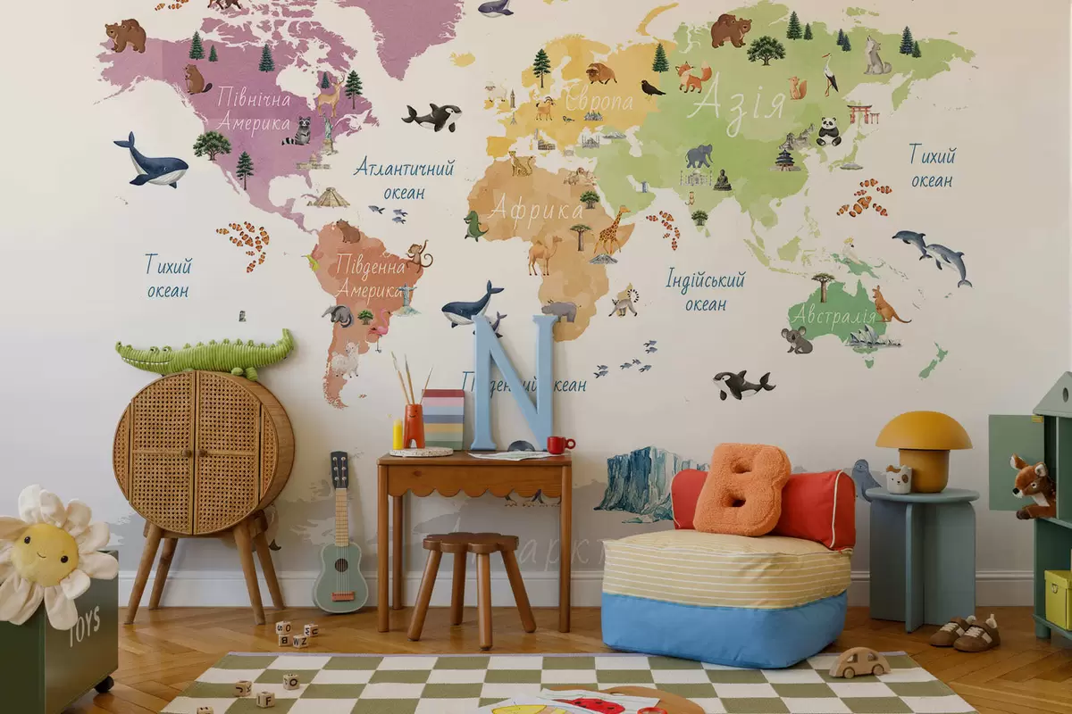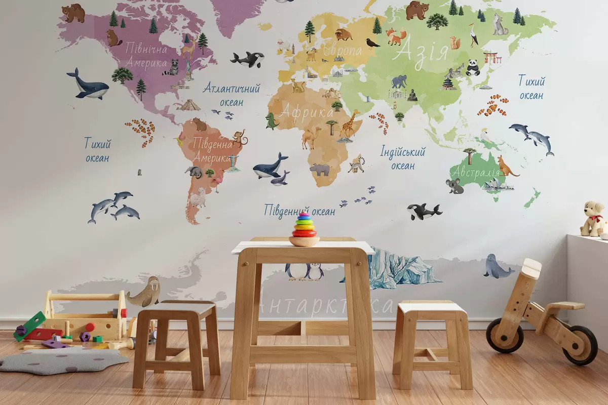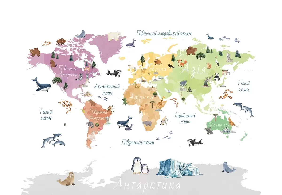 Peintures murales Une carte en couleurs de style aquarelle représentant des animaux, des plantes et des bâtiments. Légendes en ukrainien Nr. c00009uk