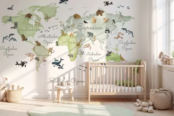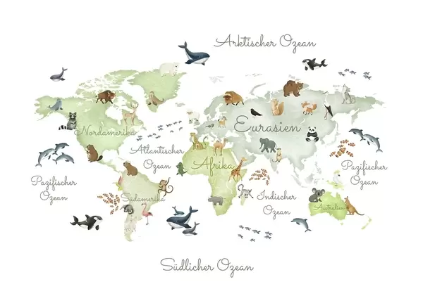 Peintures murales Une carte verte de style aquarelle mettant en scène des animaux. Légendes en allemand Nr. c00012dev2