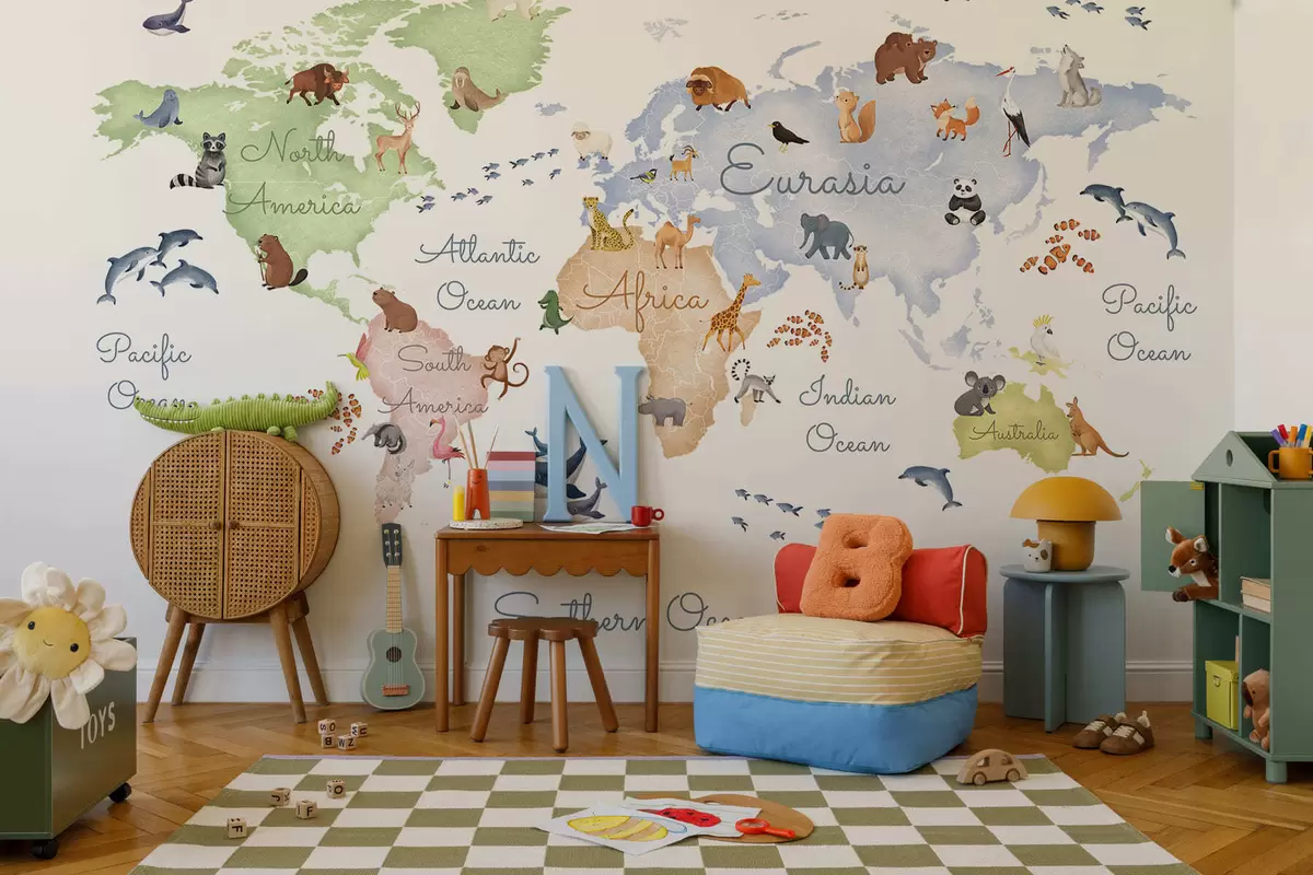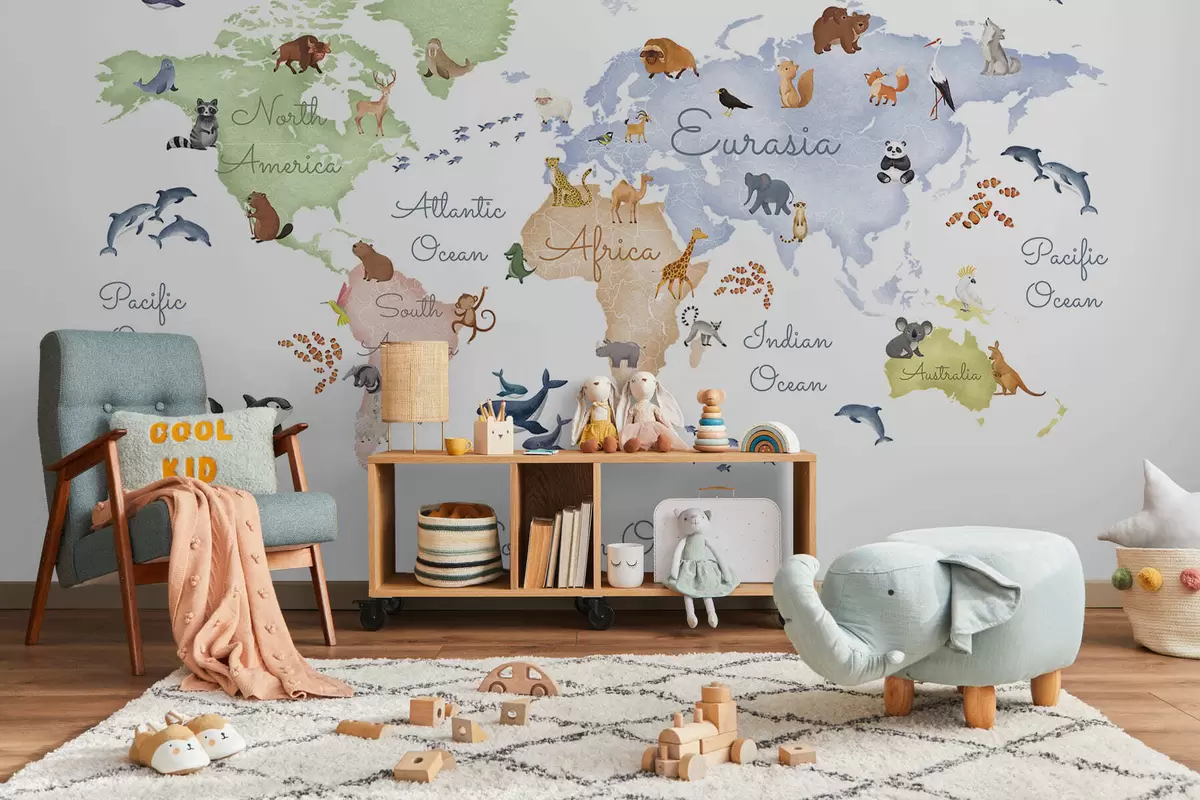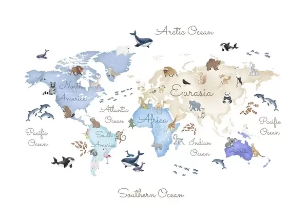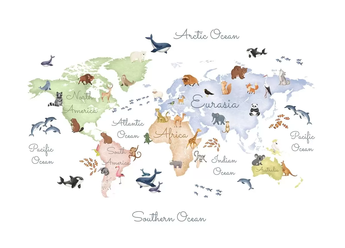 Peintures murales Une carte en couleurs de style aquarelle représentant des animaux. Légendes en anglais Nr. c00012en