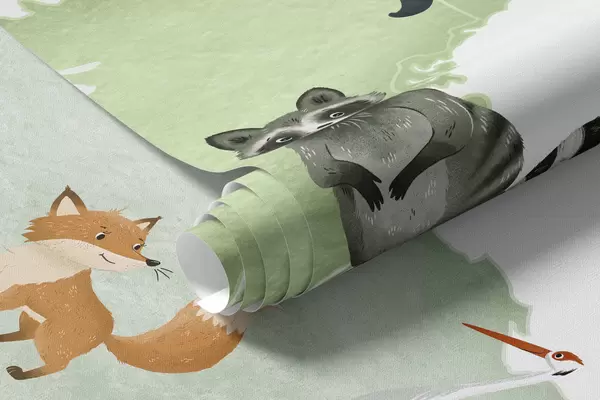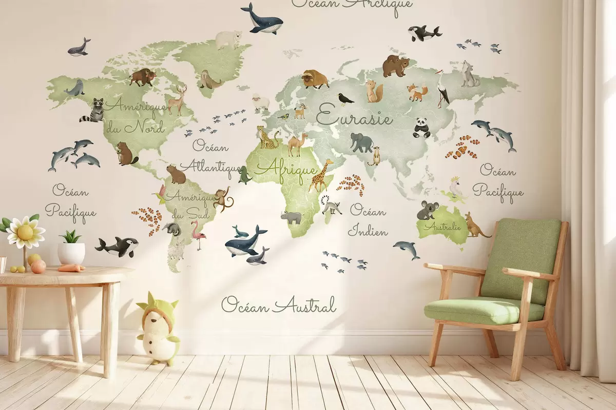Peintures murales Une carte verte de style aquarelle mettant en scène des animaux. Légendes en français Nr. c00012frv2