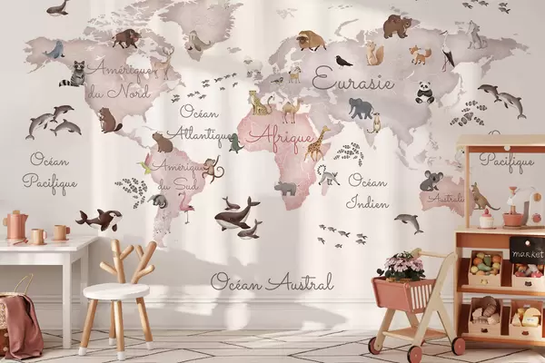 Peintures murales Une carte de couleur beige, de style aquarelle, illustrée d'animaux. Légendes en français Nr. c00012frv3