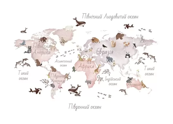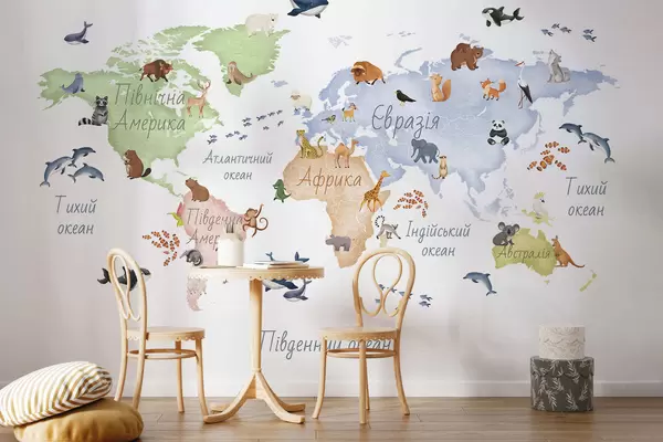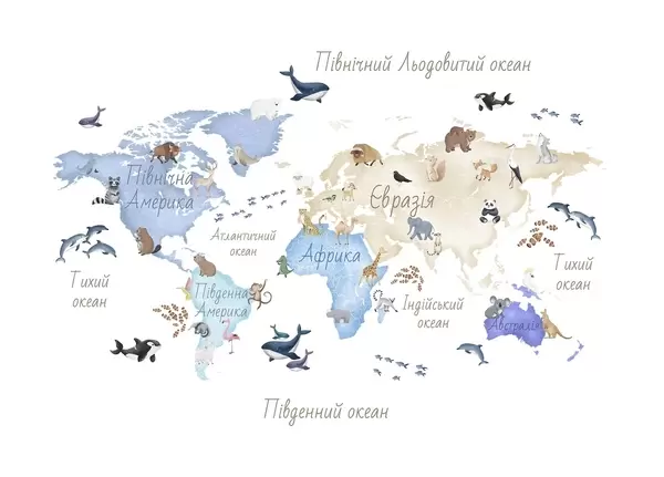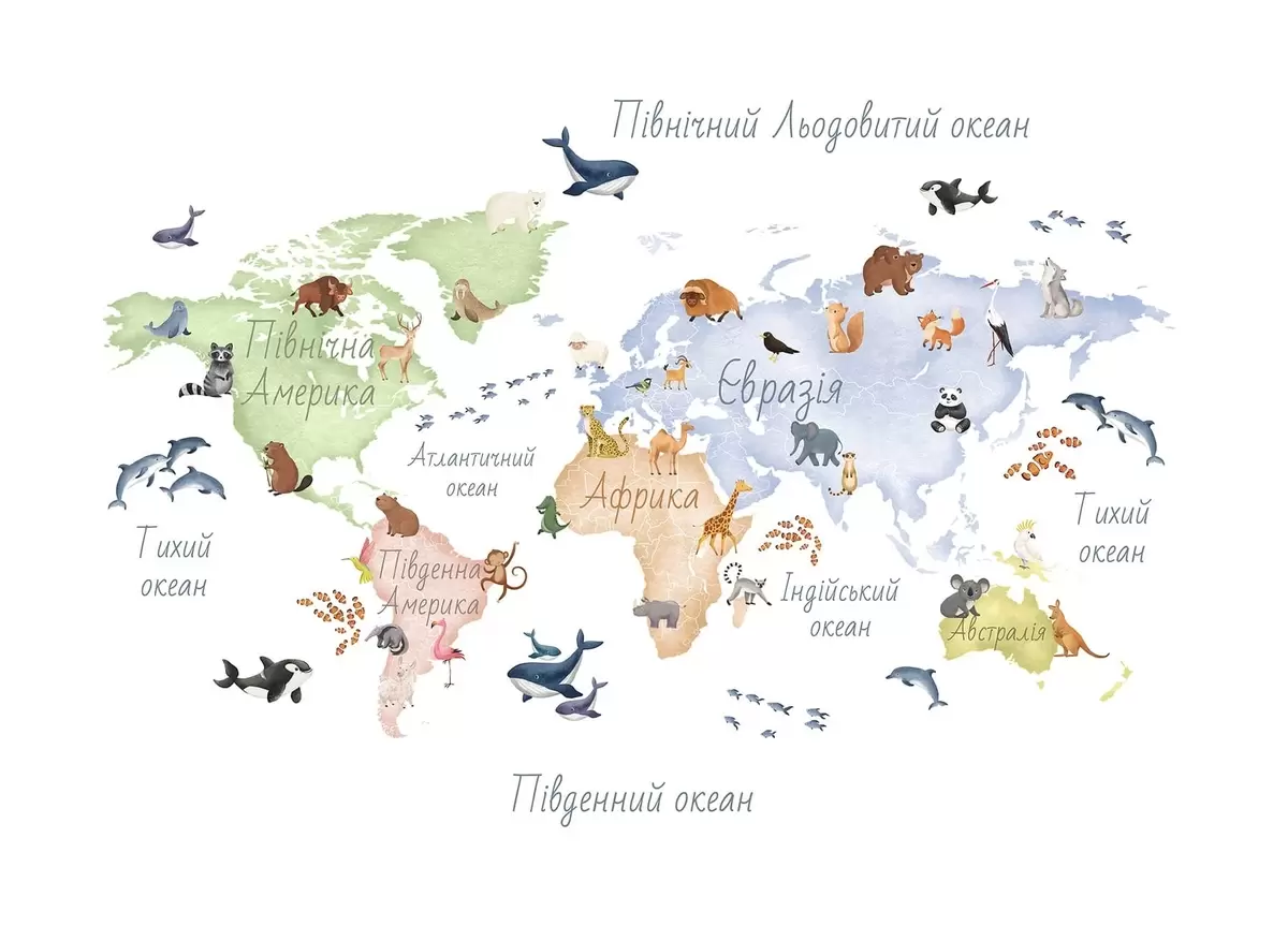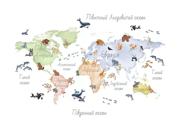 Peintures murales Une carte en couleurs de style aquarelle représentant des animaux. Légendes en ukrainien Nr. c00012uk