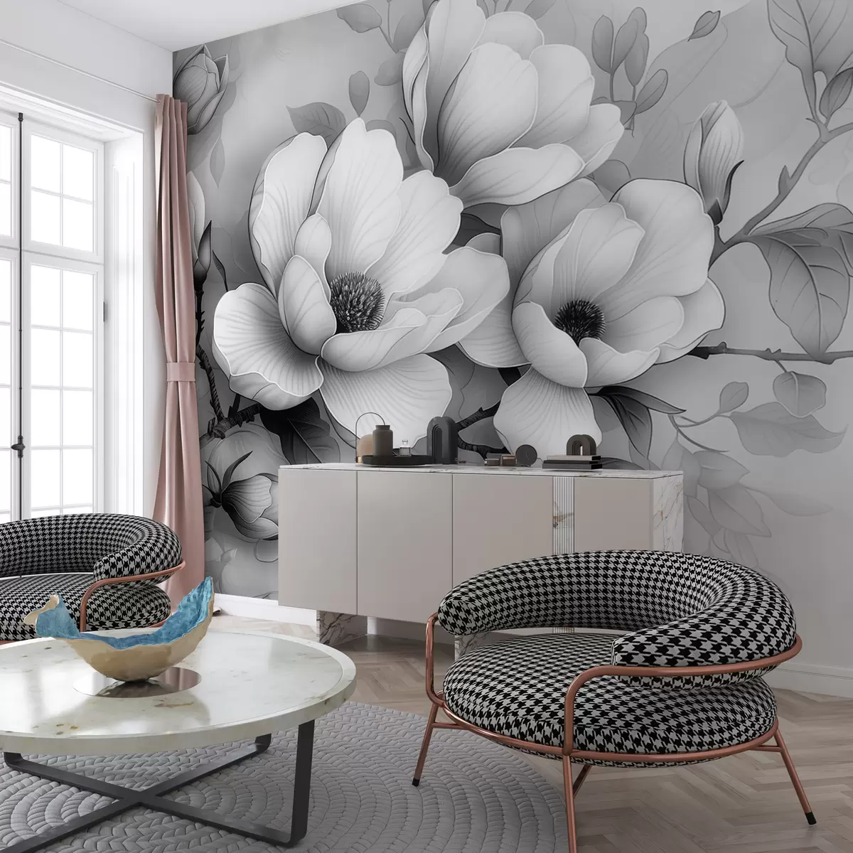 Peintures murales Illustration en noir et blanc d'un magnolia sur fond gris Nr. w01277