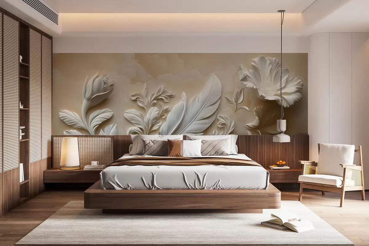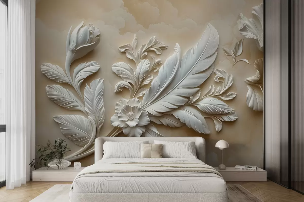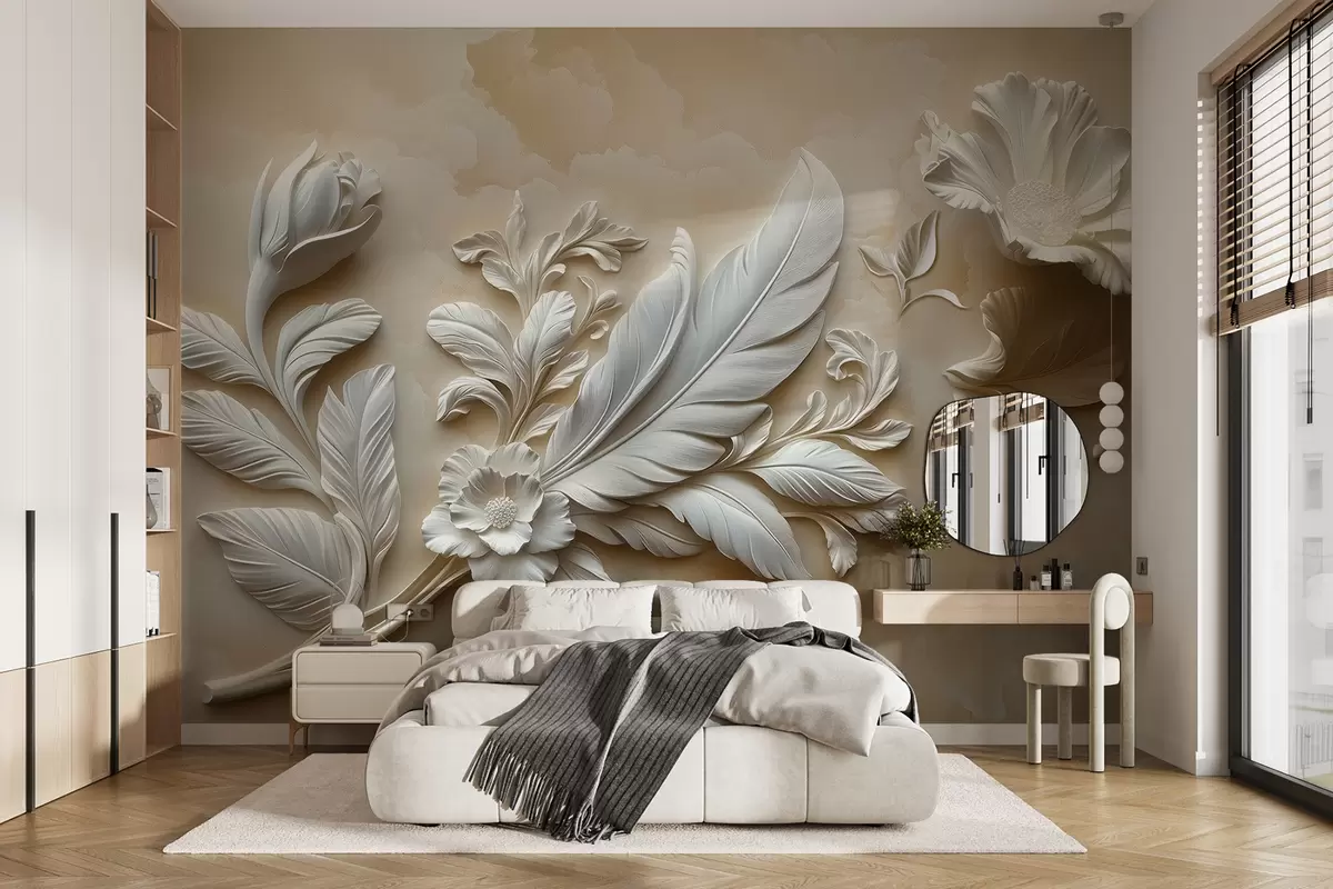 Peintures murales Fleurs en relief gracieuses avec feuilles et plumes dans des tons beiges Nr. w01355