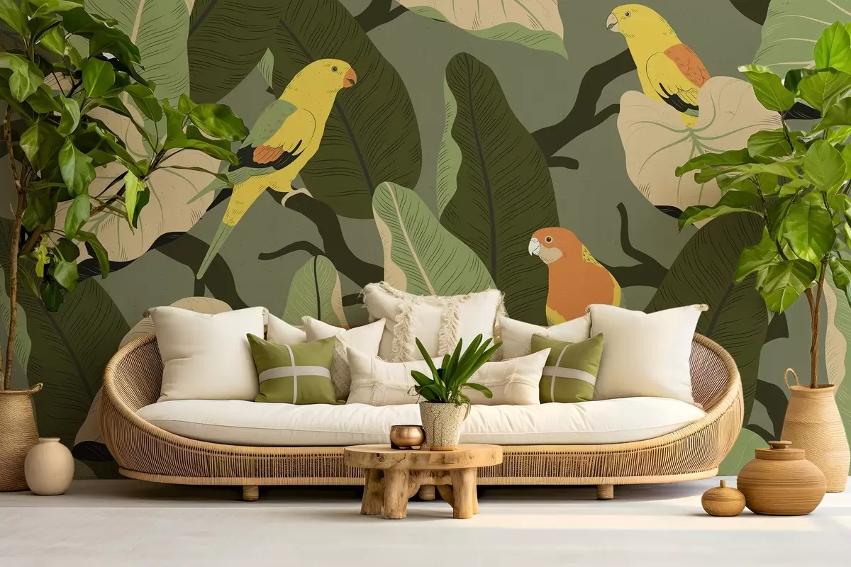 Peintures murales feuilles tropicales avec perroquets Nr. w02402