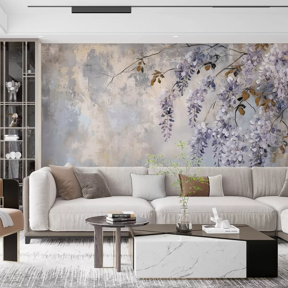 Peintures murales papier peint texturé aux couleurs douces et sourdes avec des fleurs et des branches de glycine délicates. Nr. w02451
