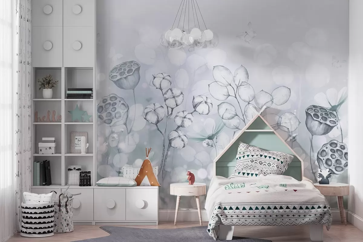 Peintures murales Jardin de fleurs de rêve, papillon, fleurs de coton, lotus, couleurs grises Nr. w02516v2