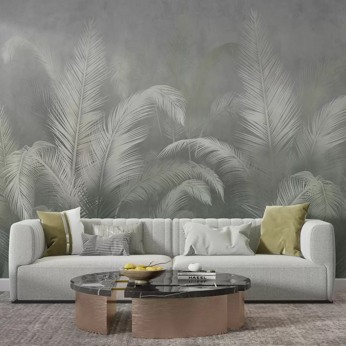 Peintures murales Feuilles de palmier tropicales en style grunge en couleur verte Nr. w03250v2