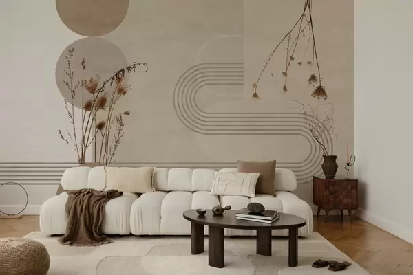 Peintures murales géométrie élégante et fleurs séchées dans les tons beiges Nr. w03449