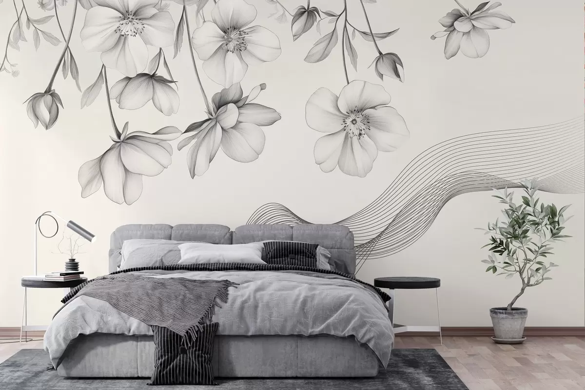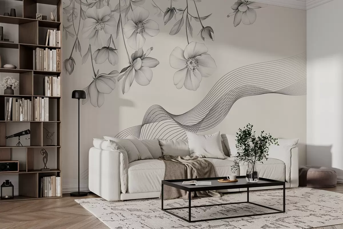 Peintures murales fleurs et lignes graphiques sur fond clair Nr. w03454