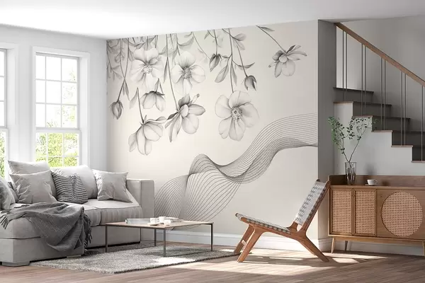 peintures murales fleurs et lignes graphiques sur fond clair w03454