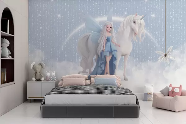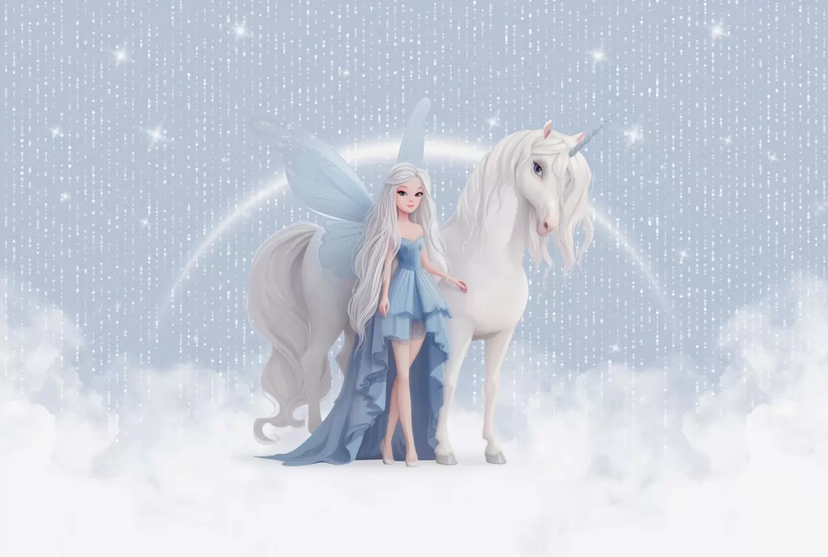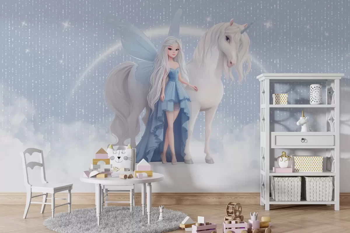 Peintures murales Une fée avec une licorne dans les nuages Nr. w03527v1