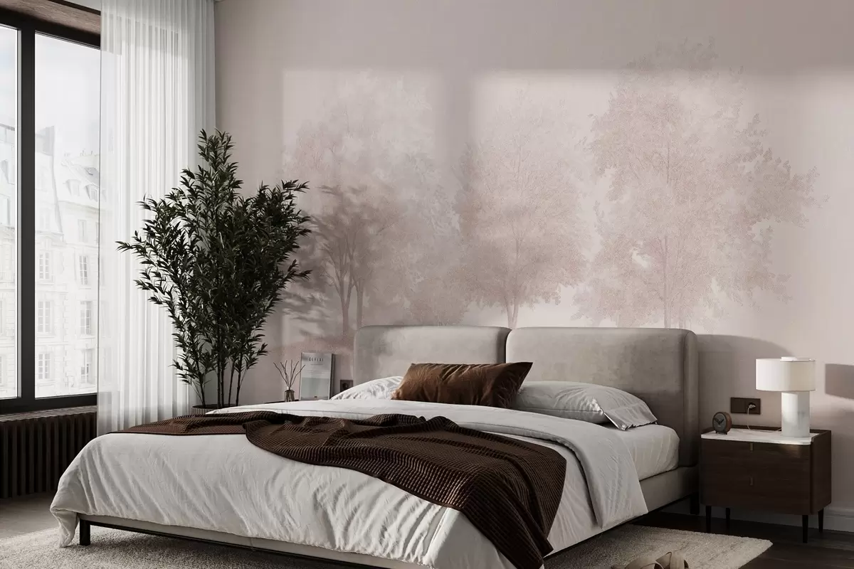 Peintures murales Arbres en fleurs, printemps, dessin au crayon, couleurs roses, nature Nr. w03549