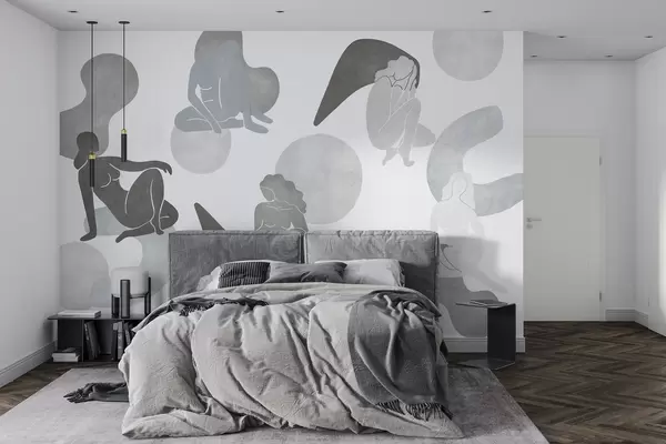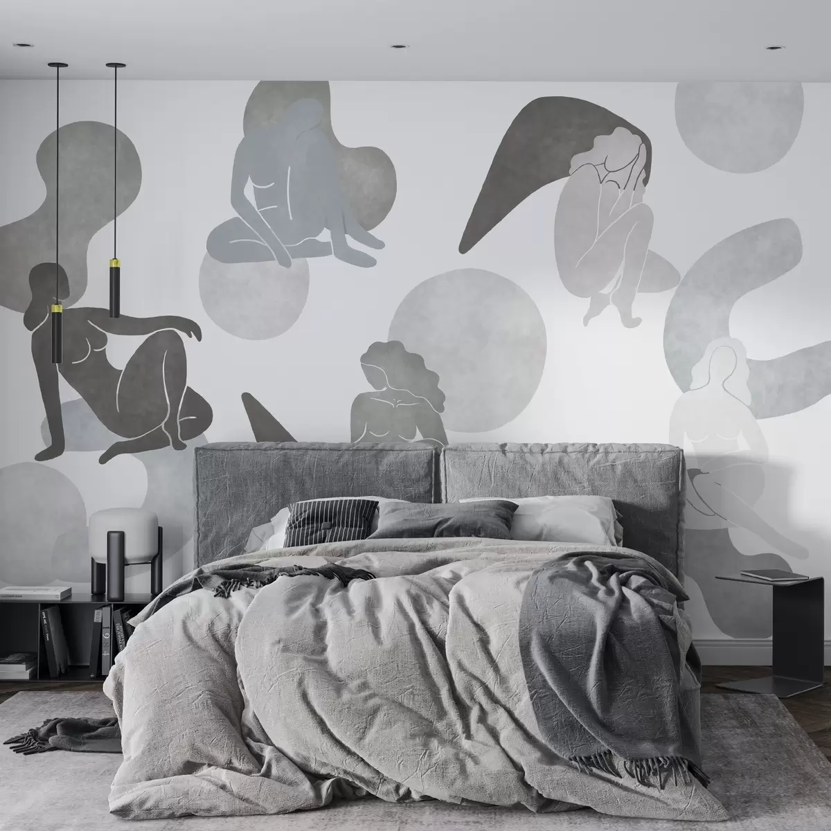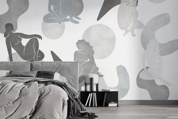 Peintures murales Abstractions géométriques avec silhouettes féminines, style boho, couleurs grises Nr. w03753v5