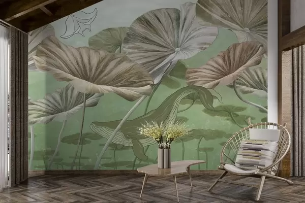 Peintures murales Baleine parmi les lotus géants dans l'eau verte Nr. w03807