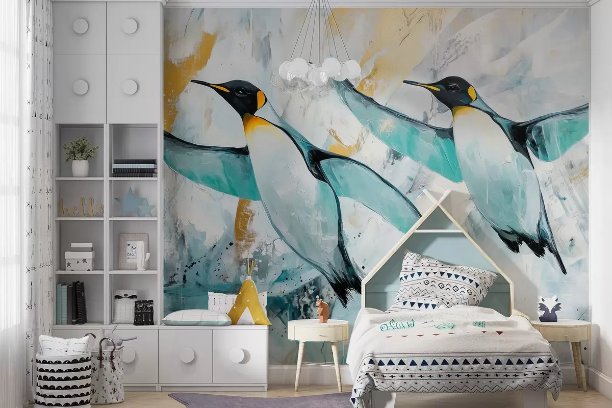 Peintures murales Mignons pingouins, Antarctique, glace bleue, animaux, dessin à l'huile Nr. w03883