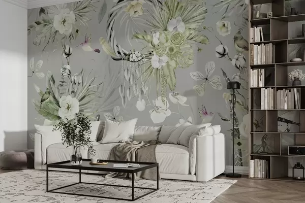 Peintures murales Ornement de style boho avec fleurs de pivoine et oiseaux, style aquarelle, couleurs vertes Nr. w03885v2