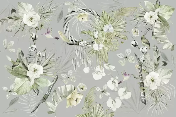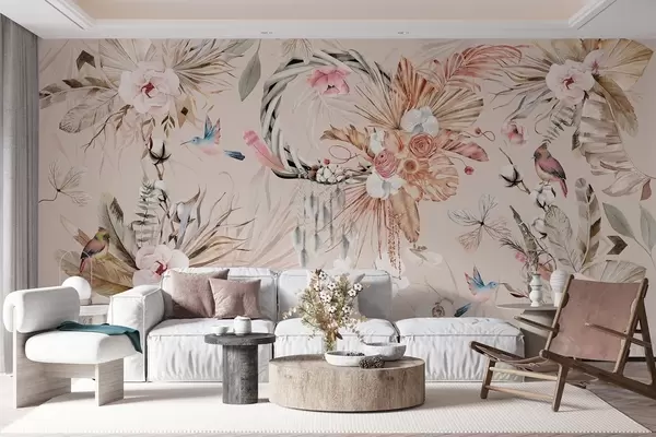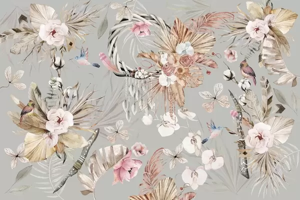 Peintures murales Ornement de style boho avec des fleurs de pivoine et des oiseaux, style aquarelle, couleurs douces Nr. w03885v3