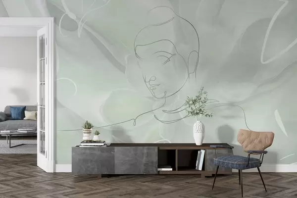 Peintures murales Abstraction florale avec dessin au trait de Bouddha, couleurs vertes Nr. w04004v3