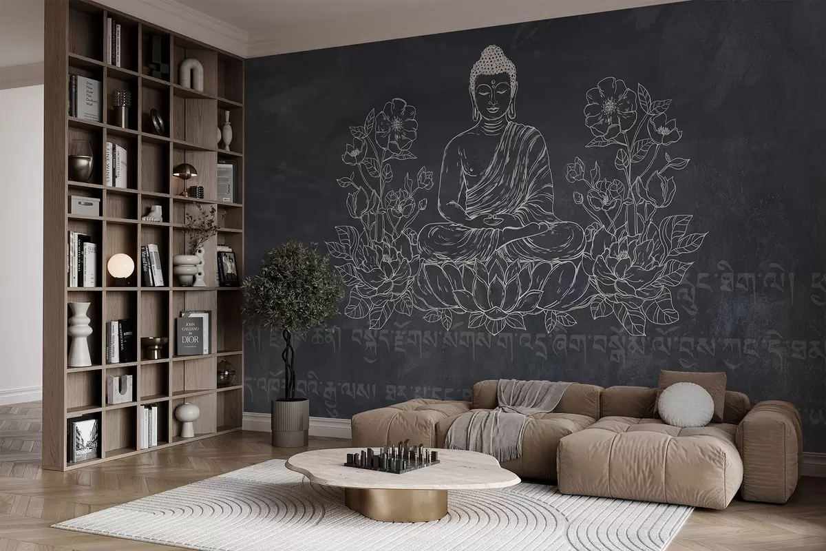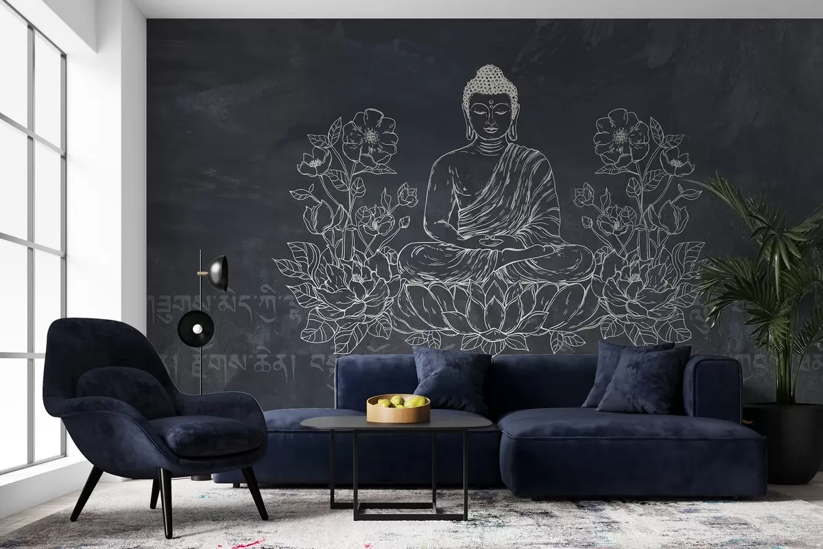 Peintures murales Bouddha en méditation avec des fleurs de lotus, dessin au trait, oriental, fond sombre Nr. w04008