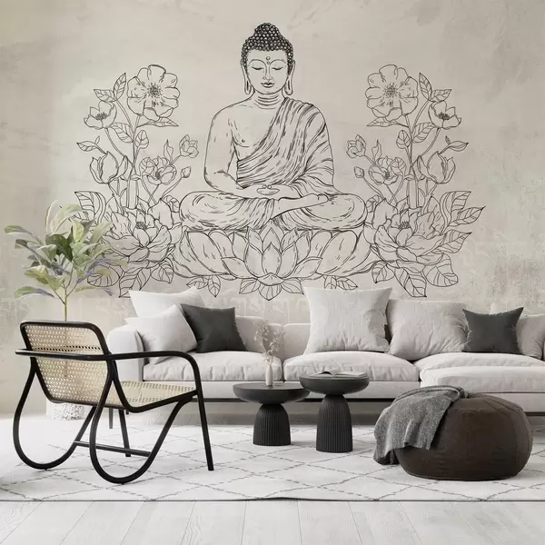 Peintures murales Bouddha en méditation avec des fleurs de lotus, dessin au trait, oriental, fond beige Nr. w04008v1