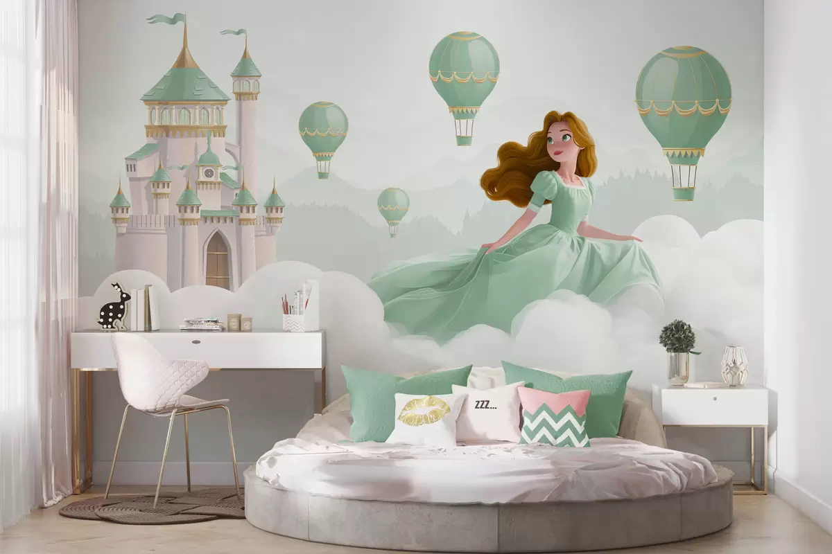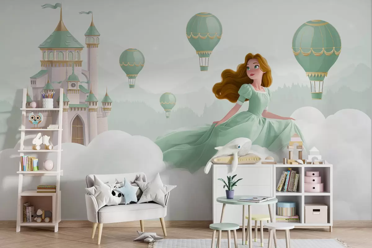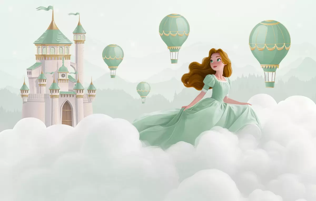 Peintures murales Princesse parmi les nuages sur fond de paysage avec château Nr. w04015v2