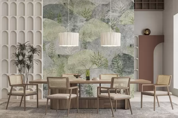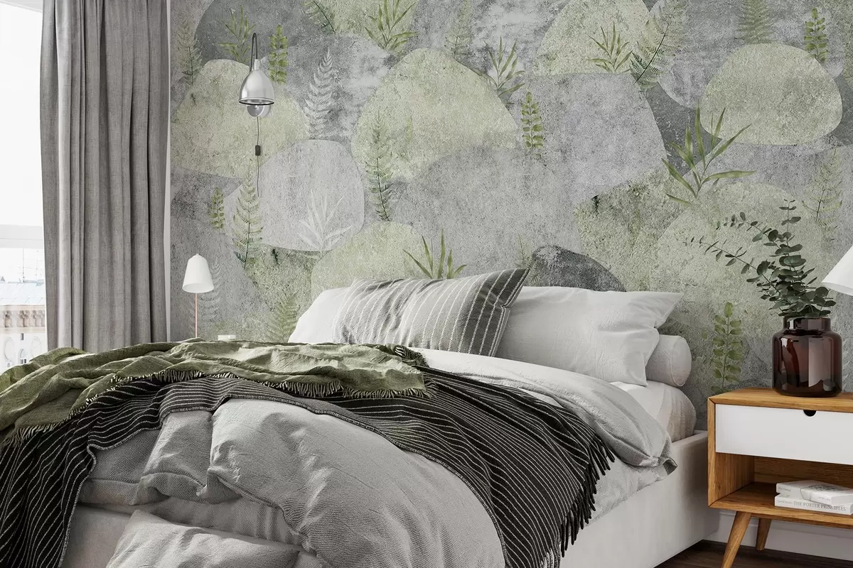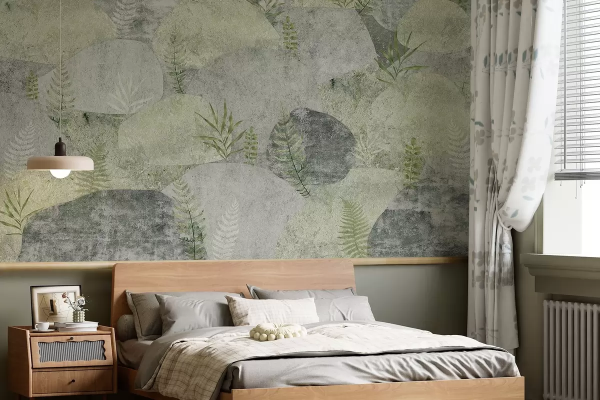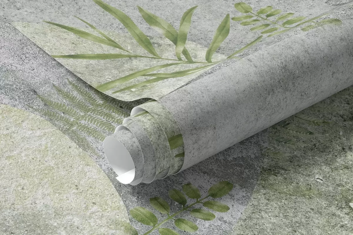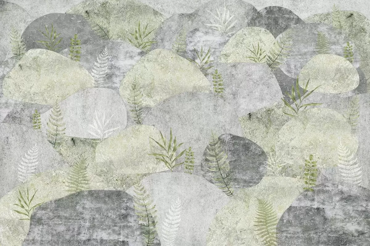 Peintures murales Pierres avec plantes, fougères, style nordique, rustique, couleurs grises et vertes Nr. w04064v2
